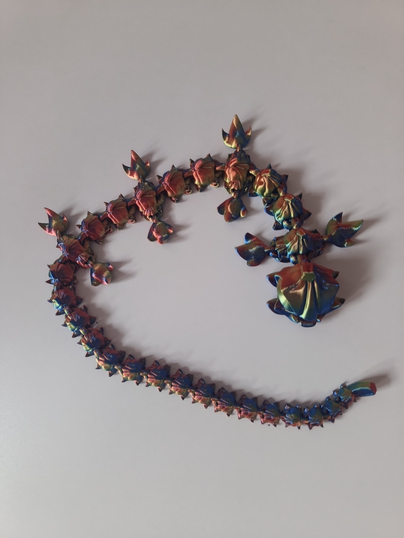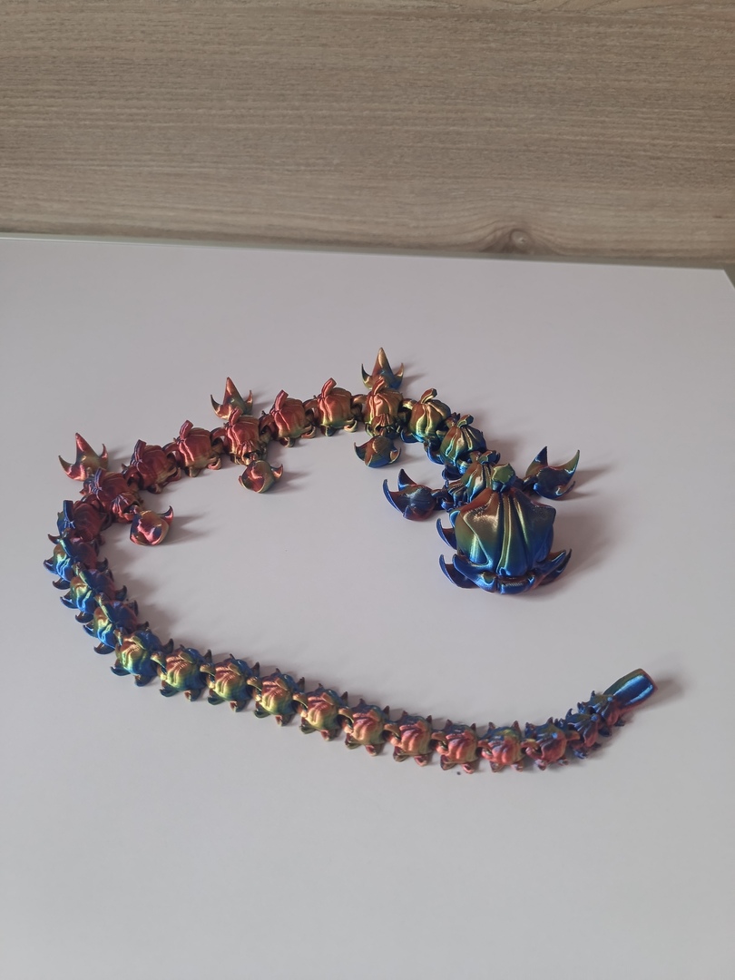 Spotkanie fantasy z jesiennym klimatem – smok flexi z charakterystycznymi elementami dyni na ciele, wydrukowany w jedwabistym filamencie Silk w trzech przechodzących kolorach. Mieni się jak metal szlachetny – czerwień, granat i złoto zmieniają się w zależności od kąta padania światła.